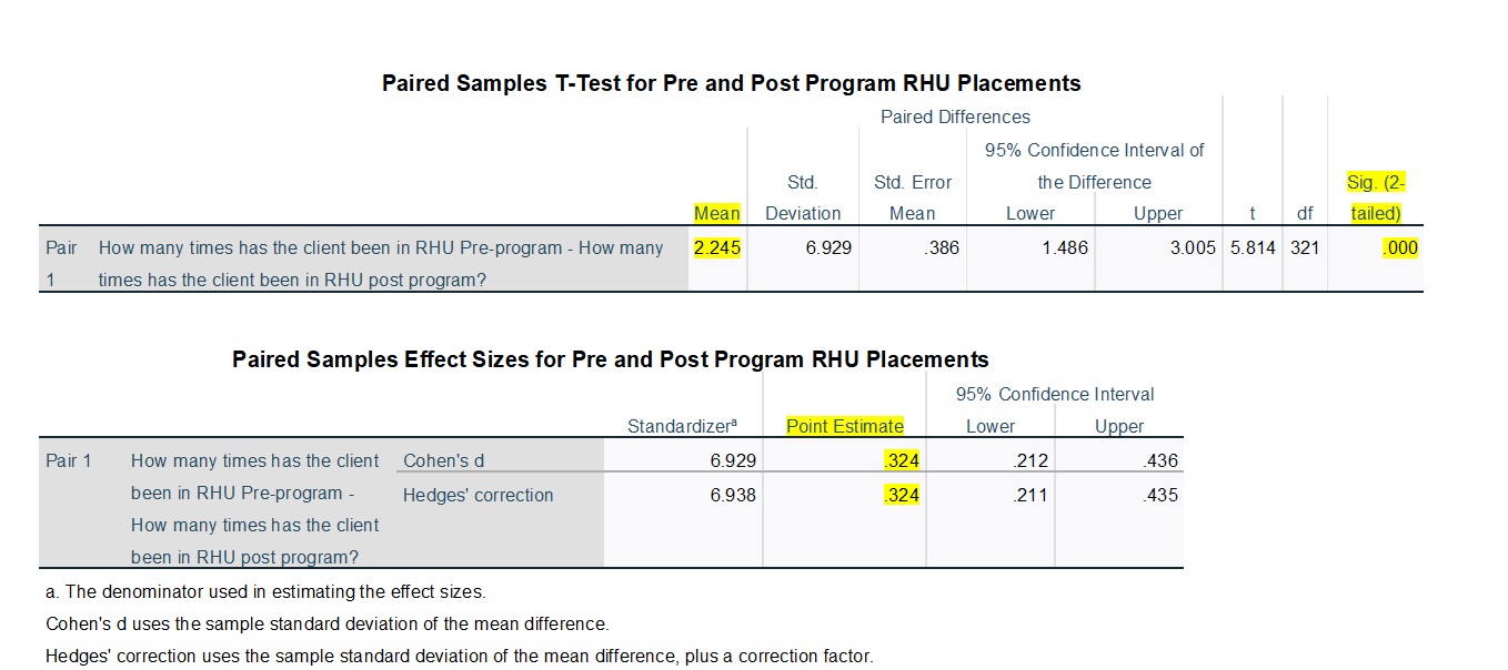 Overall, the average number of RHU placements for all 523 cases decreased significantly, with a very large effect size. This reduction in RHU placements was also statistically significant for both females and males, with a slightly larger effect size revealed for males. These results indicate significant and substantial decreases in RHU placements between the Pre RHU-Program and During-RHU Program time periods.