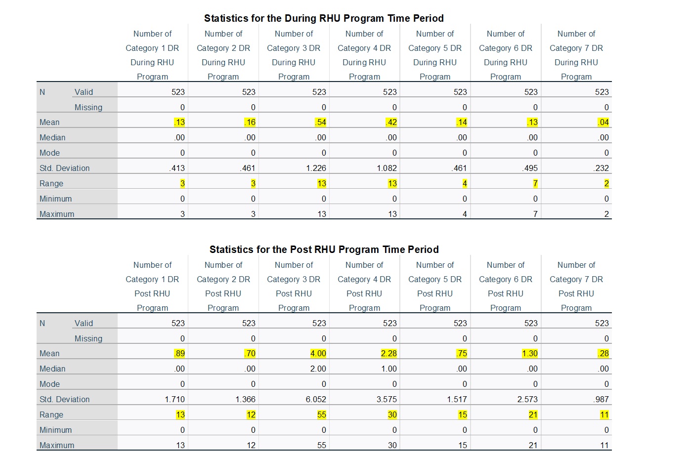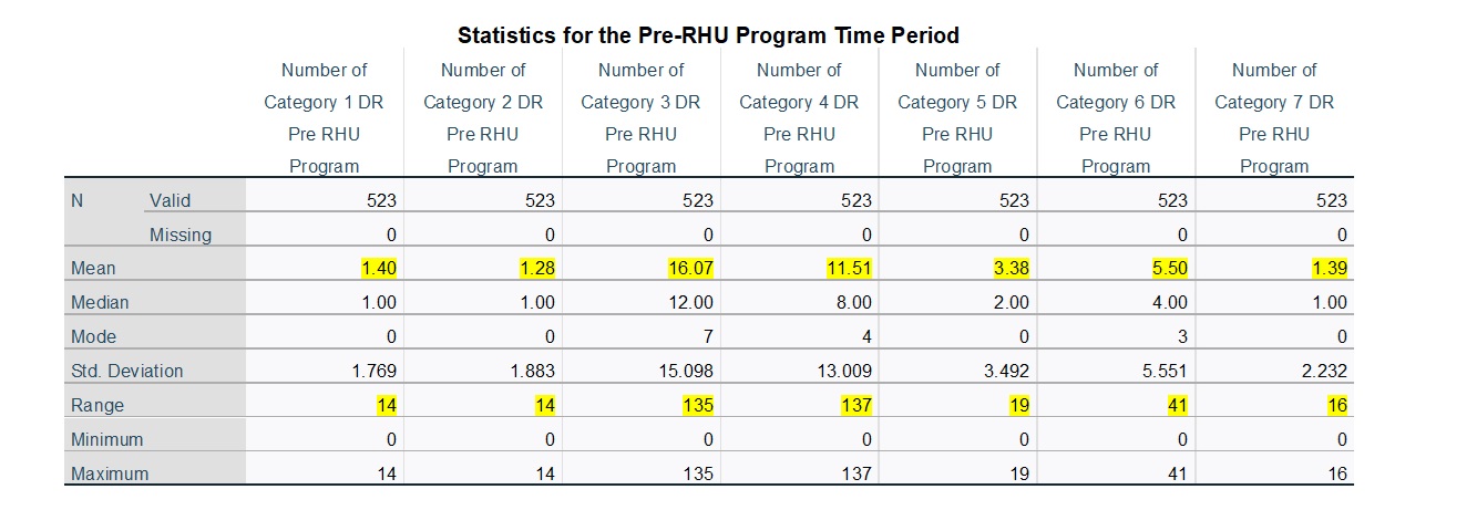 In order to produce an assessment of DRs, the following is based on descriptive statistics for the DR variables during the Pre-RHU Program, During-RHU Program, and Post-RHU Program time periods, for the 523 total cases. In all three time periods, the average frequencies were highest for Category 3 and Category 4. These two categories also presented the widest range of DR frequencies across the 523 cases. It is noteworthy that the average numbers of DRs were much higher during the Pre-RHU Program time period, lower during the Post RHU Program time period, and very low for the During-RHU Program time period. The highlighted information in the tables identifies important results. Based on these tables, the following interpretations can be made.