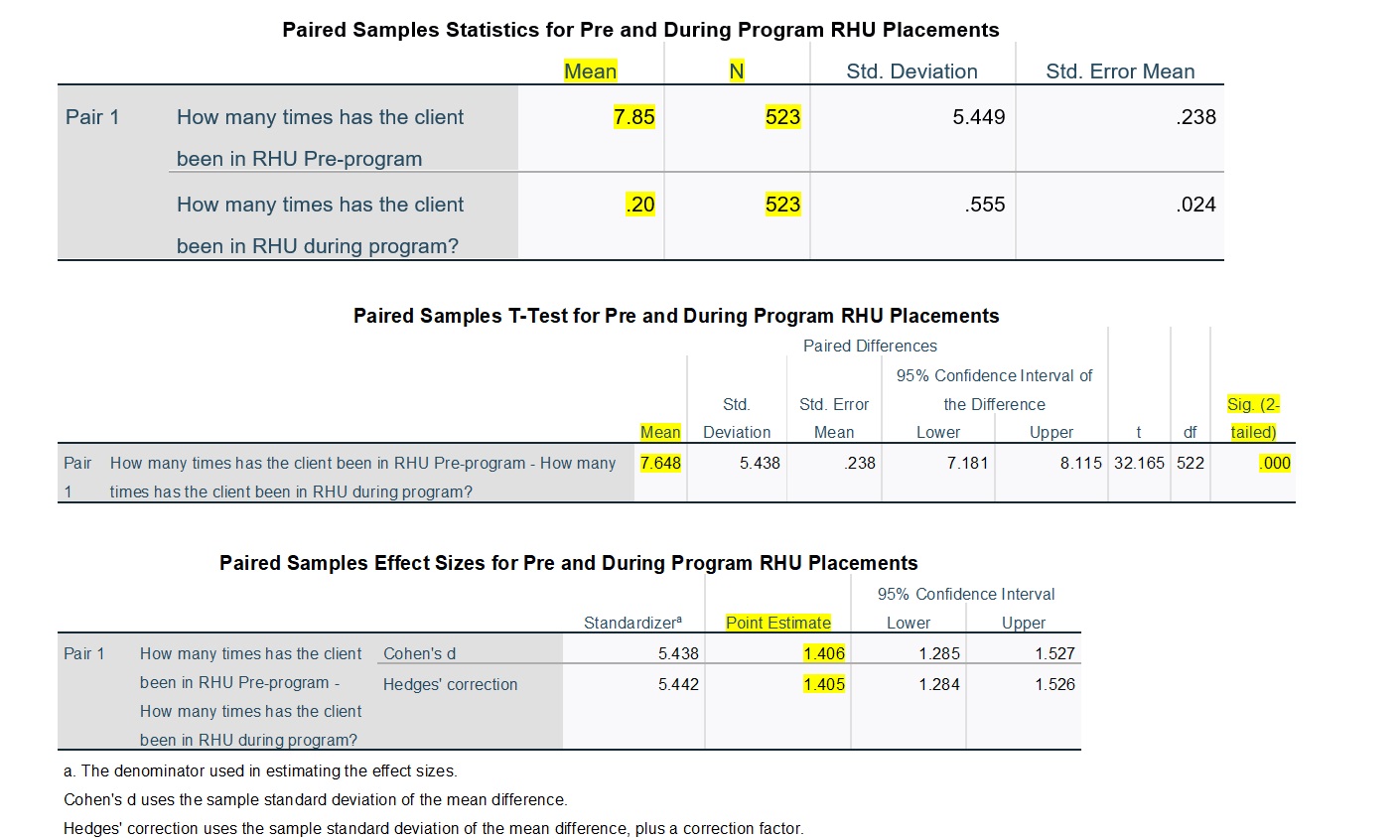 This research question is answered through paired samples t-tests using the 523 total cases representing program participants. Relevant tables are presented starting on page 16. The following is a summary of the paired samples t-tests: