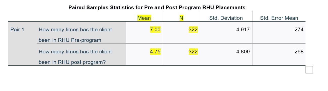 These tests examine differences (changes) in the average number of RHU placements between the Pre RHU-Program and Post-RHU Program time periods, for the 322 cases representing program completers. The initial evaluation examines these differences for all 322 completed cases. Subsequent assessment make the same comparisons, but with males and females assessed separately.