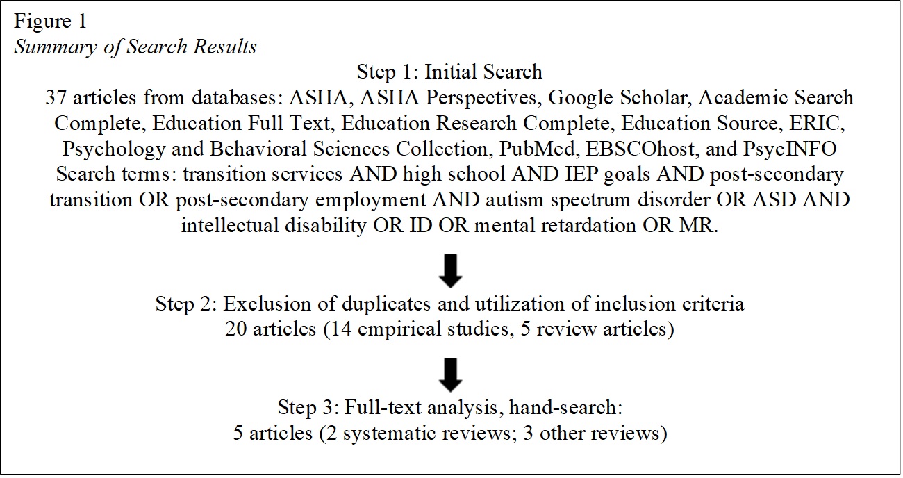 Research design and treatment duration did not limit study inclusion. Databases and websites, including ASHA, ASHA Perspectives, Google Scholar, Academic Search Complete, Education Full Text, Education Research Complete, Education Source, ERIC, Psychology and Behavioral Sciences Collection, PubMed, EBSCOhost, and PsycINFO, were searched using the following terms: Transition services AND high school AND IEP goals AND post-secondary transition OR post-secondary employment AND autism spectrum disorder OR ASD AND intellectual disability OR ID OR mental retardation OR MR AND systematic review OR review OR meta-analysis.