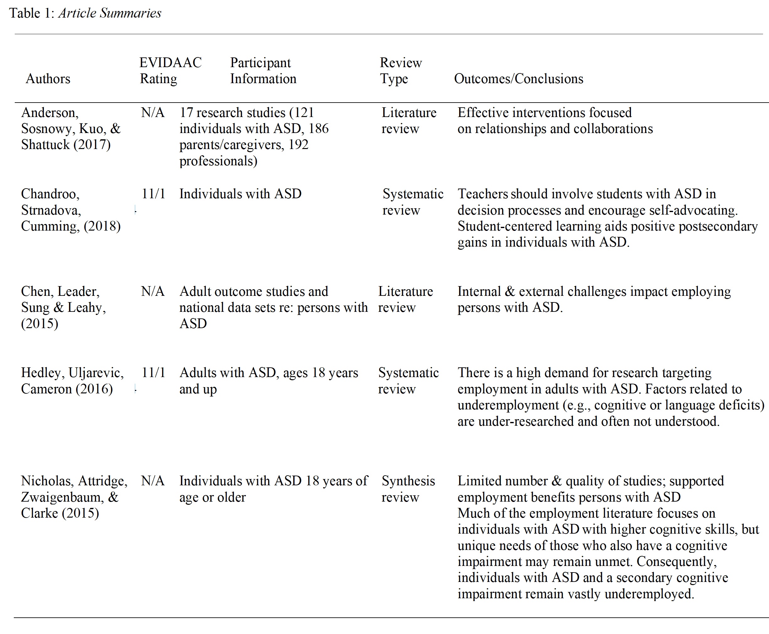 Chandroo et al. (2018) conducted a systematic review to research how much involvement students with ASD have in their transition planning. In the 15 articles that met inclusion criteria for their study, the authors reported an overall lack of student involvement in their transition planning processes. Similar to the Hedley et al (2017) results, the Chandroo et al. (2018) systematic review earned a score of 11/14 on the EVIDAAC rating scale. We were not able to identify if the authors attempted to locate unpublished studies, conducted hand-searches of references, or posted a log of rejected studies.