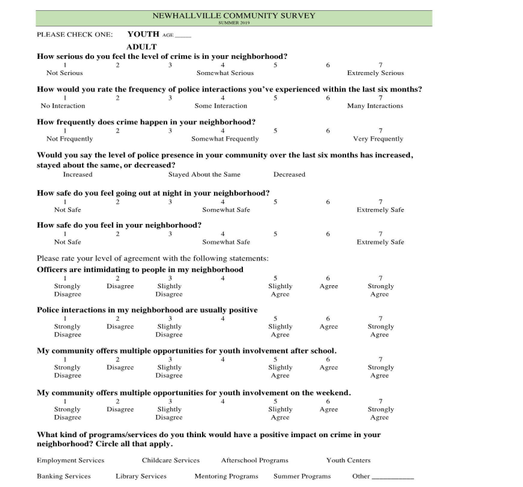 In summer 2018, a community survey was distributed to Newhallville residents, and this survey was re-administered in the summer of 2019 (see Appendix B). Using convenience sampling at various community events, 79 community members completed the survey in 2018, while 162 community members completed the survey in 2019. In addition to examining basic descriptive statistics, independent samples t-tests were conducted on the survey data to assess differences between groups. The findings from the surveys are presented below.