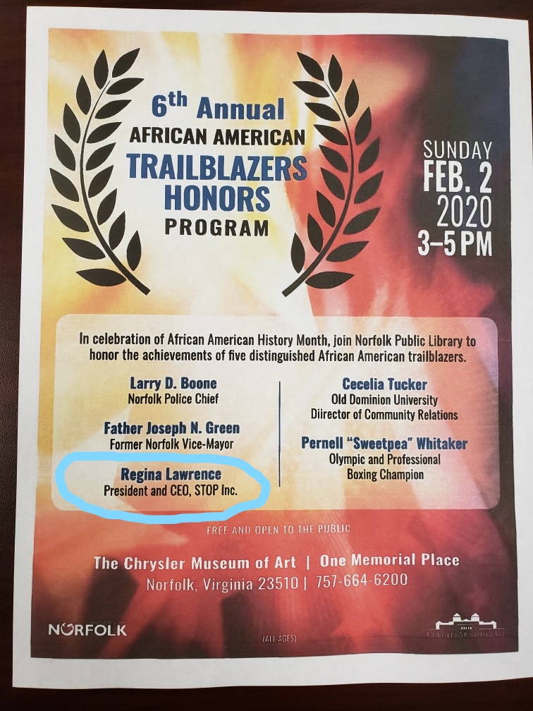 Pioneer leader in evidence-based leadership and organizational development, Regina Lawrence, President and CEO, STOP Inc, is honored at the African American Trail Blazers Award ceremonies in Norfolk, VA Feb. 2nd.
